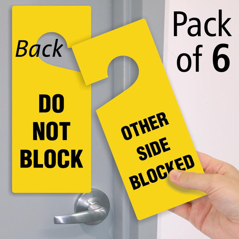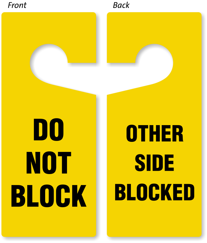 Use this two-sided door hanger to either instruct people not to block the way, or inform everyone that the other side of the door is blocked. A single tag serves two purposes.