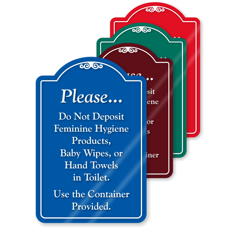 Politely request individuals to use the container given to throw feminine hygiene products, baby wipes and hand towels In the toilet, with our eye-catching designer sign.