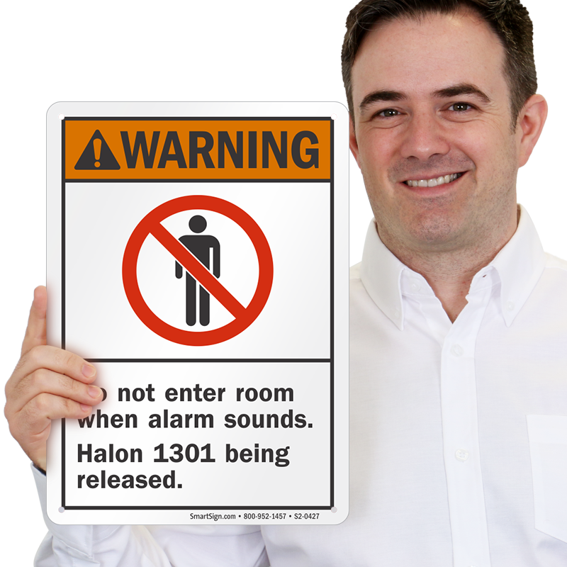 ANSI Warning Sign notifies employees and visitors of taking a note of the alarm and not entering the room where Halon 1301 is being released.