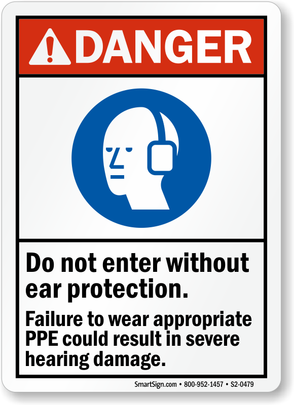 ANSI Danger Sign: Do Not Enter Without Ear Protection, Failure To Wear Appropriate PPE Could Result In Severe Hearing Damage (With Graphic) S2-0479