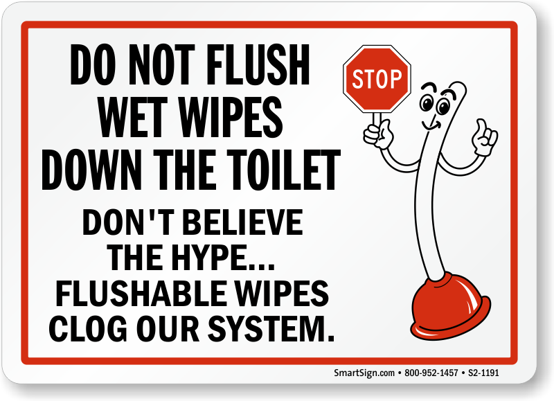 Use this Plunger Mascot Sign to prohibit bathroom users from flushing wet wipes down the toilet.
