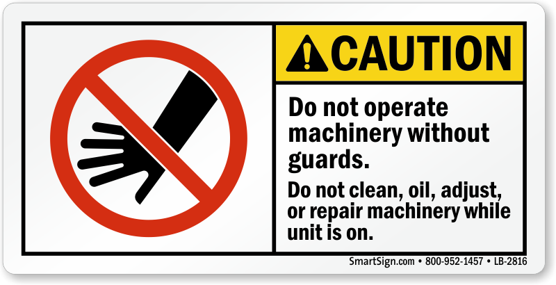 ANSI Caution Safety Label: Do Not Operate Machinery Without Guards Do Not Clean, Oil, Adjust Or Repair Machinery While Unit Is On (With No Hand Touching Graphic) LB-2816