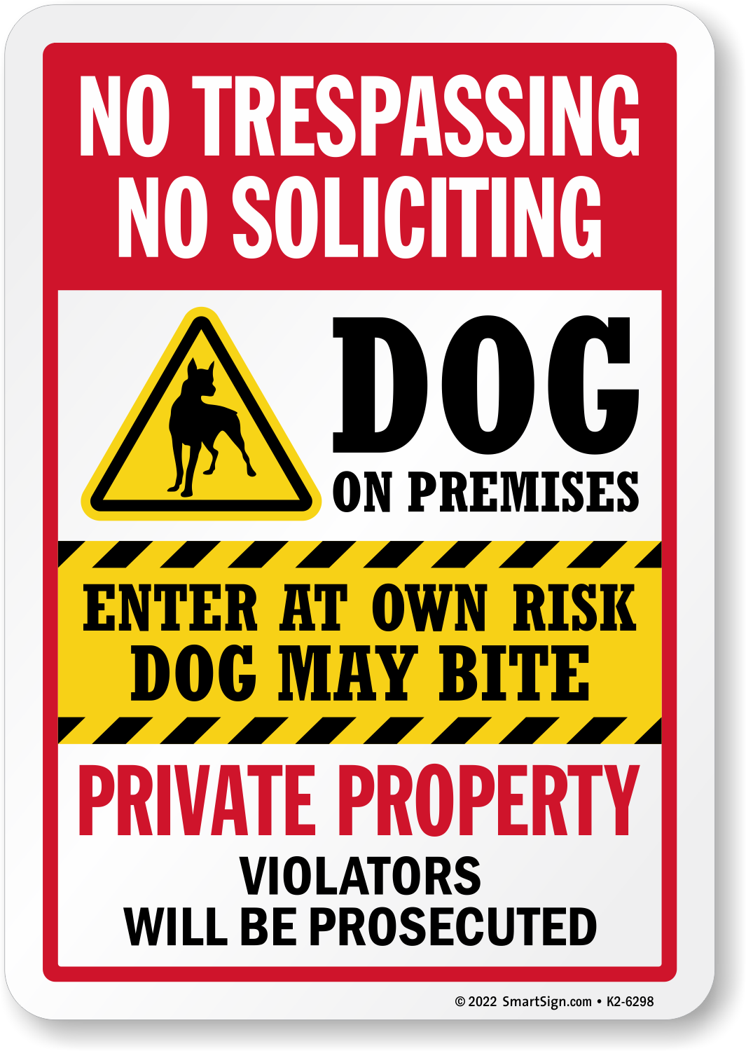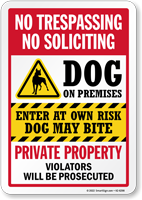 No Trespassing No Soliciting Sign: Dog On Premises, Enter At Own Risk - Dog May Bite, Private Property Violators Will Be Prosecuted K2-6298