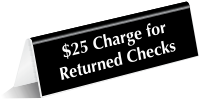 Make it clear to your customers that for every returned check $25 will be charged. Use this extremely professional-looking engraved sign so that your payment policy is communicated across effectively.