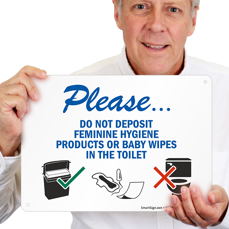 Politely ask all your female bathroom users to dump hygiene products and baby wipes in waste container. Symbols can be understood by even those who do not understand English.