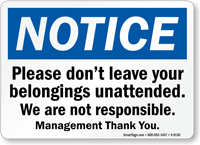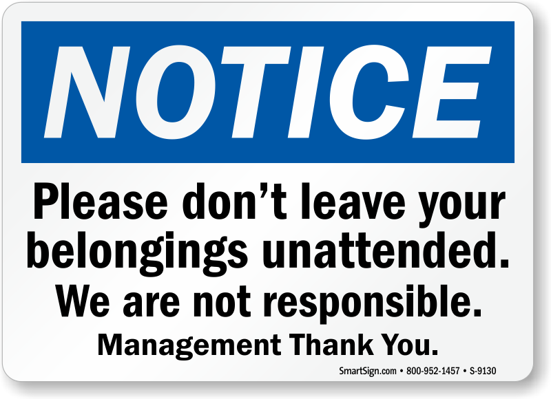Notice Company Not Responsible Sign: Please Don't Leave Your Belongings Unattended, We Are Not Responsible. Management Thank You S-9130
