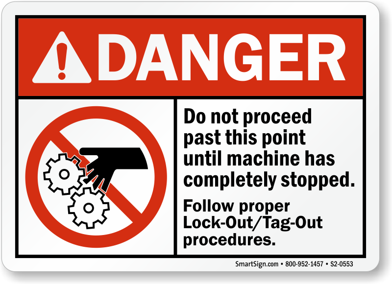 ANSI Danger Sign: Do Not Proceed Past This Point Until Machine Has Completely Stopped, Follow Proper Lock-Out/Tag-Out Procedures (With Graphic) S2-0553