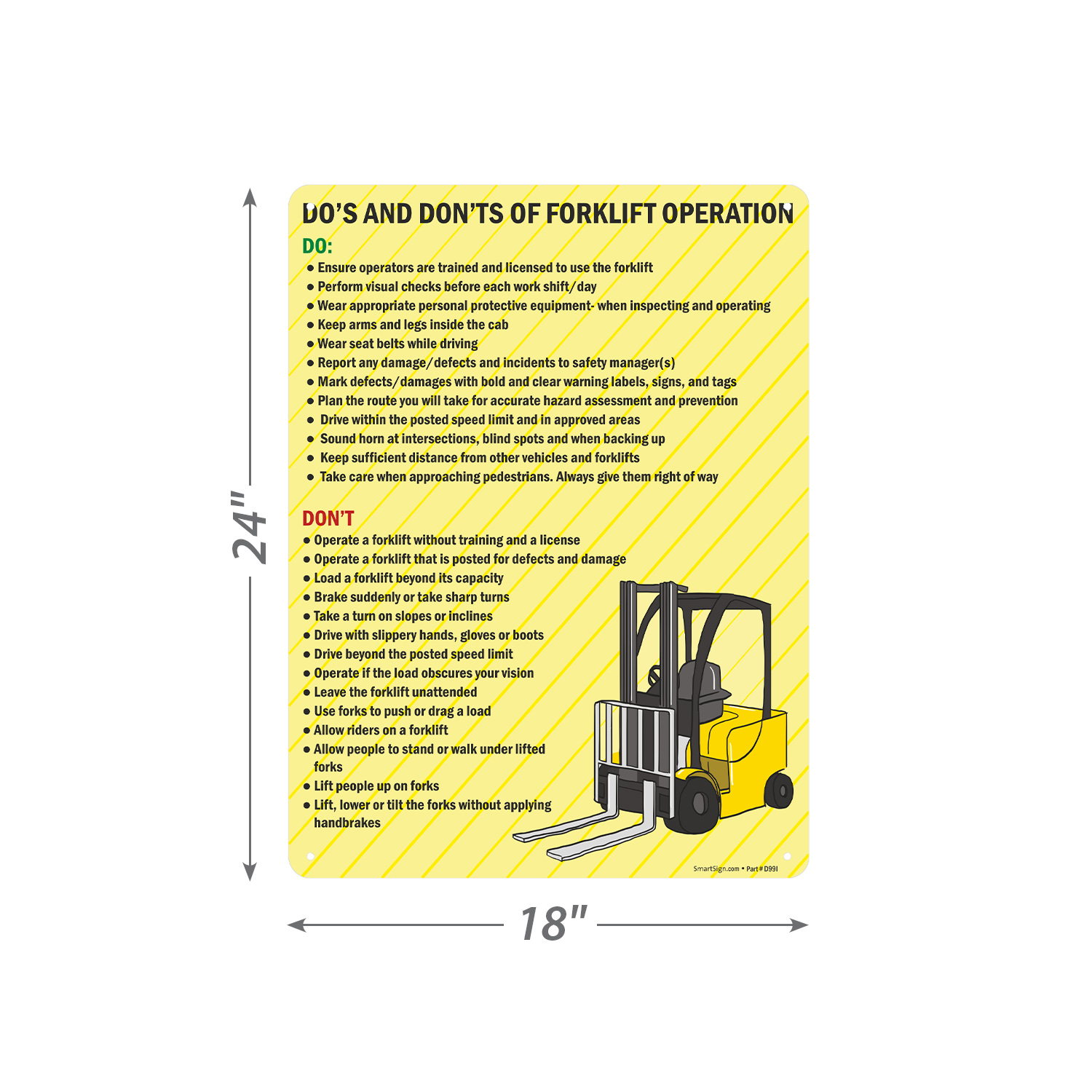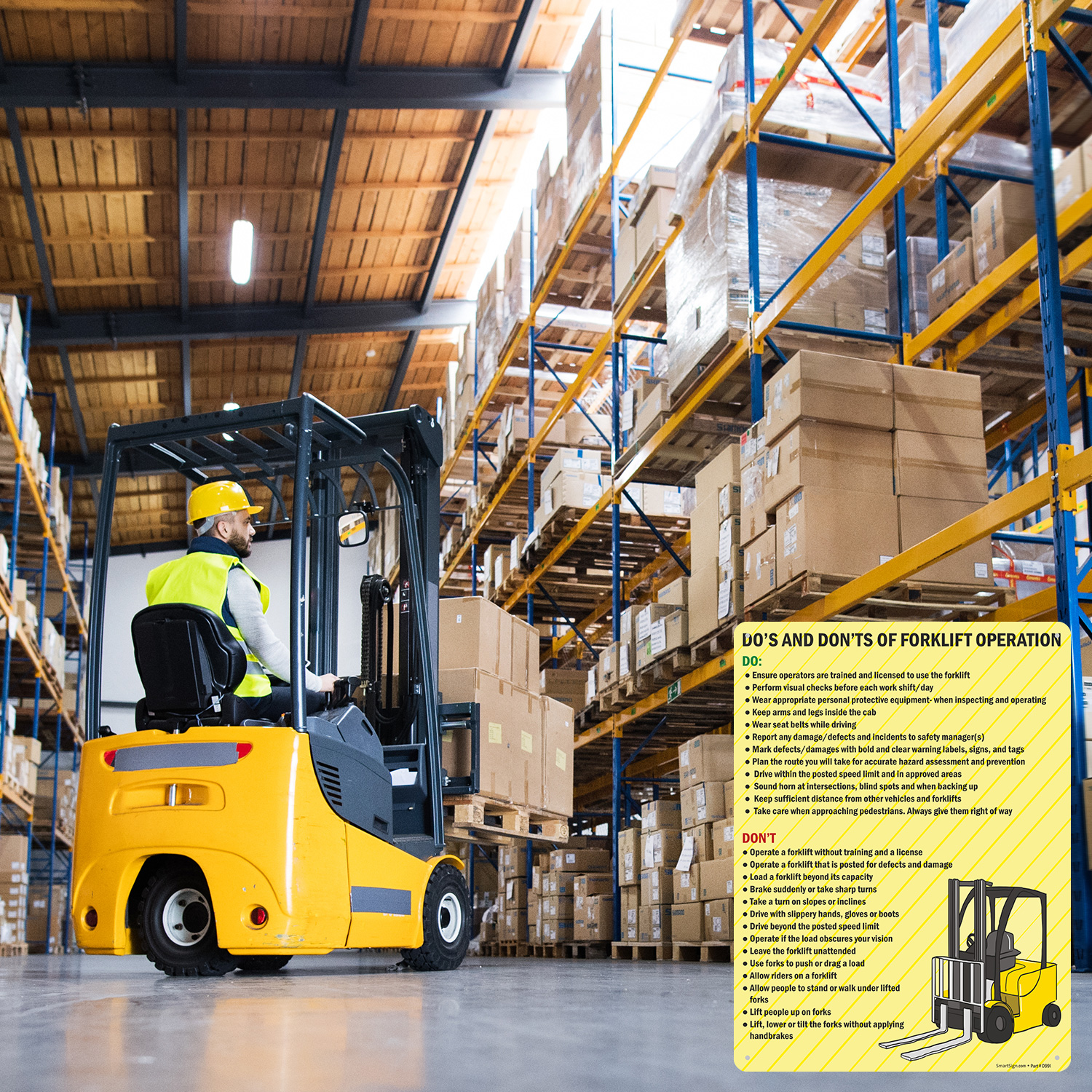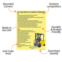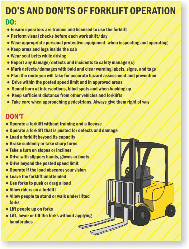 Operating forklift is crucial to safety of the operator and workers around them. A quick guide like this ensures operators know what they should and should not do while riding forklifts.