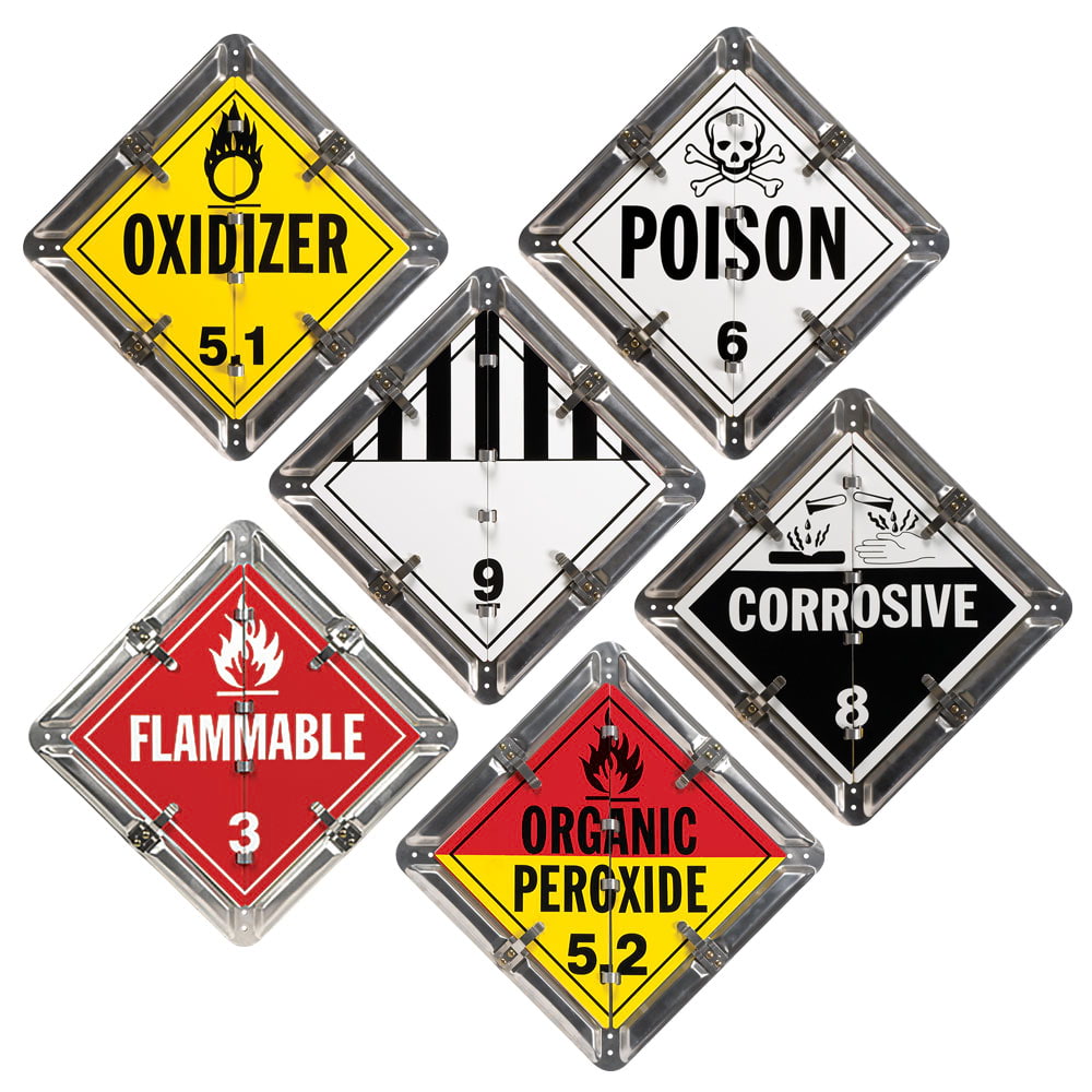 - Placard set includes six common DOT legends: Corrosive, Flammable, Miscellaneous, Organic Peroxide, Oxidizer and Poison.
