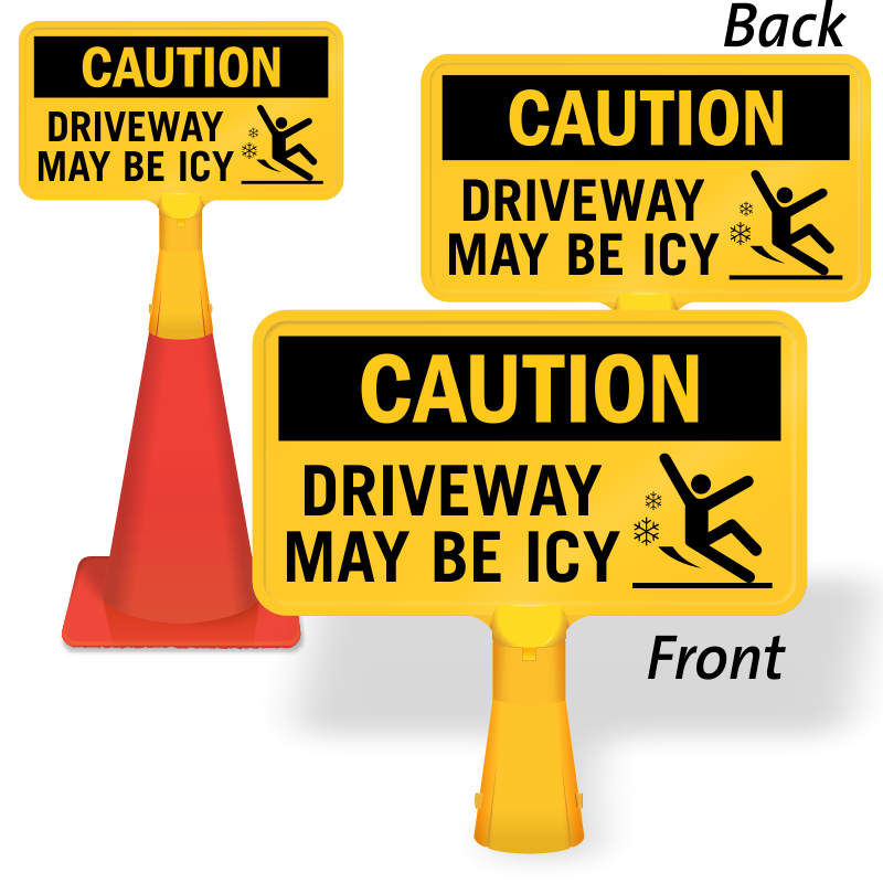 Warn people about the slippery driveways during icy conditions to prevent slipping and falling, with this highly visible no-tip, portable Traffic Cone Sign.