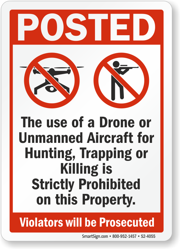 Hunting with Drone Liability Property Sign: Posted The Use Of A Drone Or Unmanned Aircraft For Hunting, Trapping Or Killing Is Strictly Prohibited On This Property. Violators Will Be Prosecuted. S2-4055