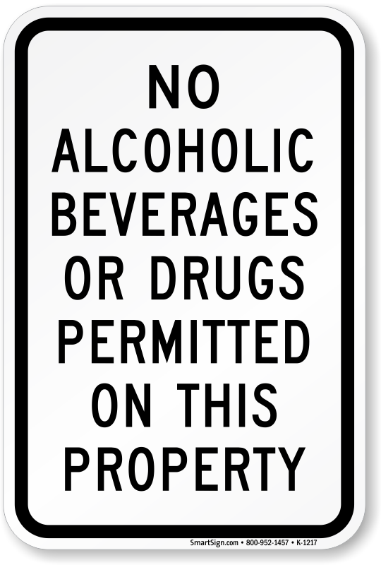 Use this "no alcoholic beverages or drugs permitted on this property" sign to make the rules clear. A sign is there, even when you aren't.