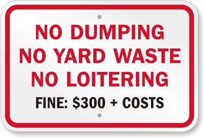 No Dumping Sign: No Yard Waste, No Loitering, Fine $300 + Costs K-7096