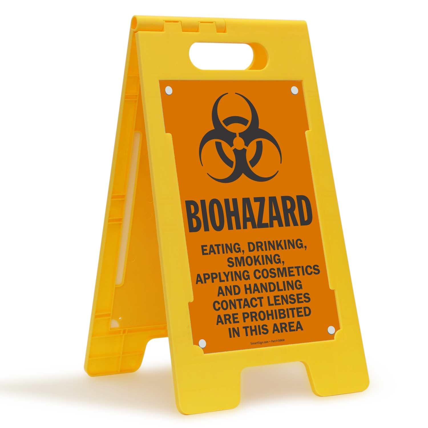 This free standing sign with universal biohazard symbol emphatically sends a reminder that activities such as eating, drinking, smoking, applying cosmetics and handling contact lenses are strictly prohibited in the area.