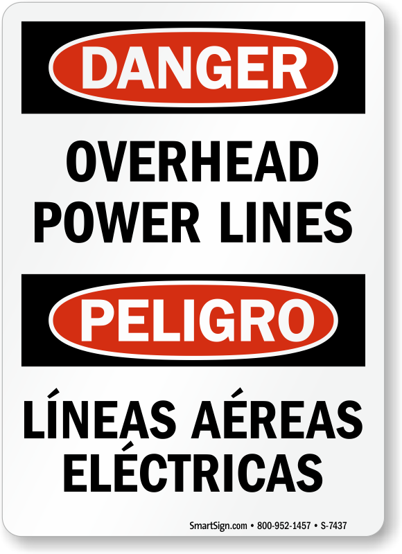 Alert maintenance personnel and others of Overhead Power Lines with this bilingual Danger sign.