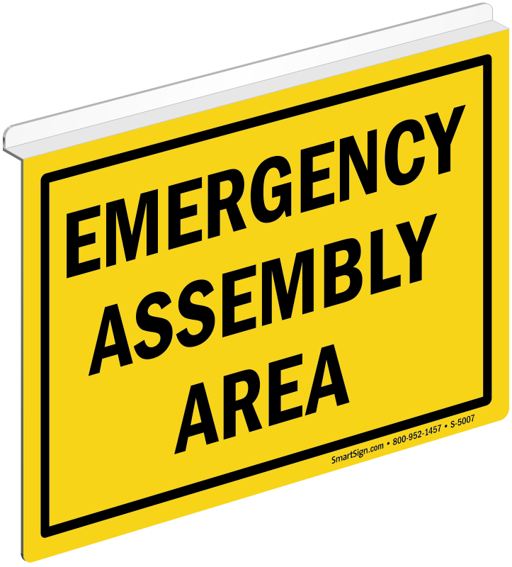 Identify the emergency assembly area of your building and make people aware of it. Use this projecting sign which is visible from both the directions.