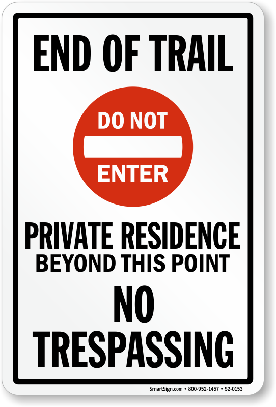 Mark End Of Trail and entry of private residence with a Do Not Enter - No Trespassing Sign.