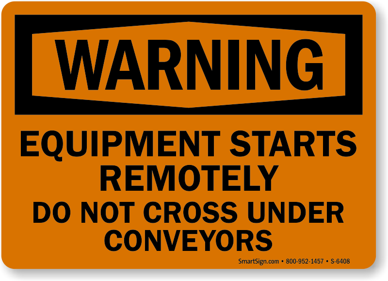 Let workers know that attempting to cross the conveyor overhead can be dangerous as it starts remotely. Use this OSHA sign to communicate the message.