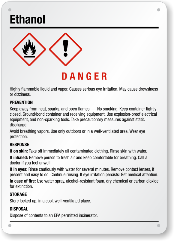 Educate your employees about the hazards associated with Ethanol. This Ethanol GHS Sign will help them take necessary precautions while handling the chemical.