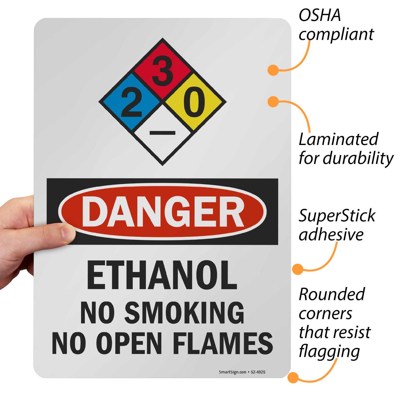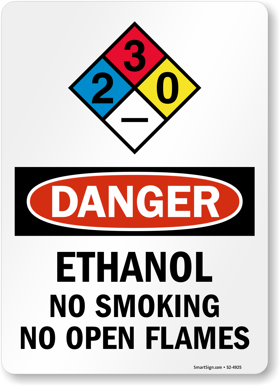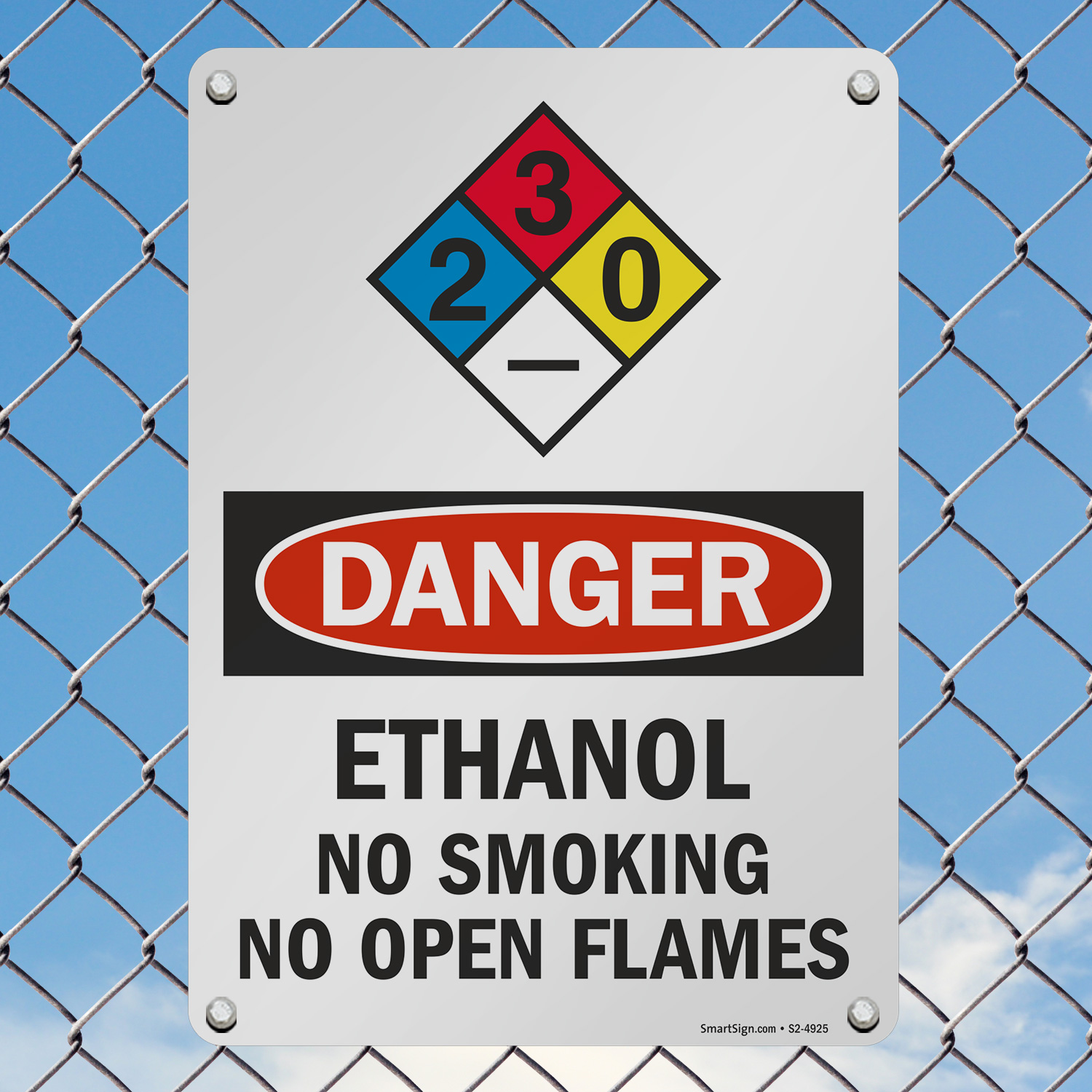 OSHA Danger Ethanol sign feature the NFPA hazcom system to alert your facility of this potential risk. This sign features NFPA rating 1 for the health hazard (blue diamond), indicating there is a slight health risk.