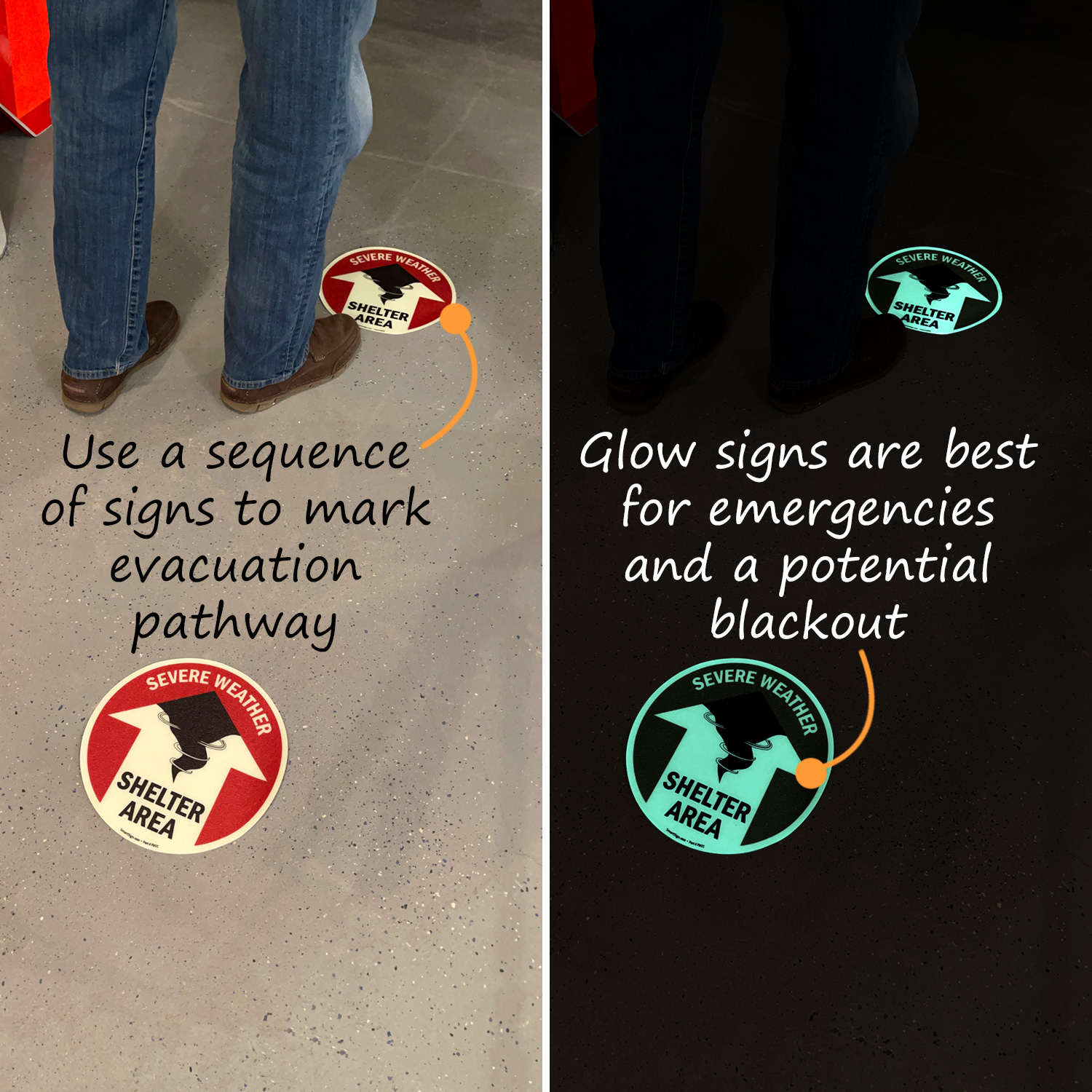 Your Severe Weather Shelter areas deserve better marking from every vantage point. Large, 17" grit floor signs are the biggest, safest complement to wall signs for a vital impact in an emergency weather situation.