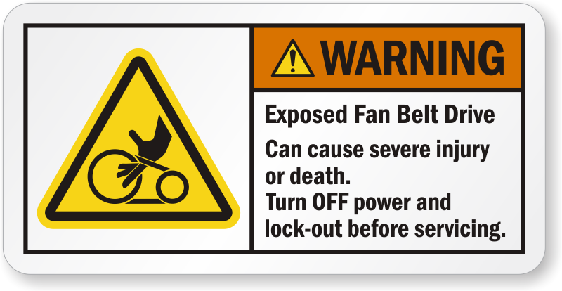 Safety holds foremost importance when working with moving machine parts. This ANSI label will notify of the potential injuries caused by exposed fan belt drive and that power should be turned off before its service.