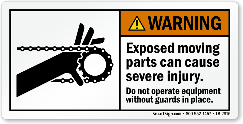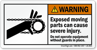 ANSI Warning Safety Label: Exposed Moving Parts Can Cause Severe Injury Do Not Operate Equipment Without Guards In Place (With Chain Drive Entanglement Hazard Graphic) LB-2815