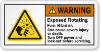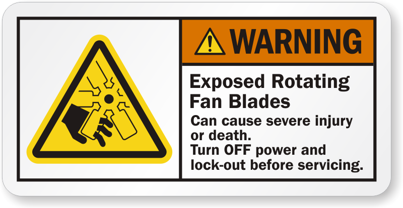 As the facility owner, the onus of displaying all the hazardous locations and situations to the workers lies with you. Apply this horizontal ANSI warning label and tell workers to be careful of the exposed rotating fan blades as it can cause injury.