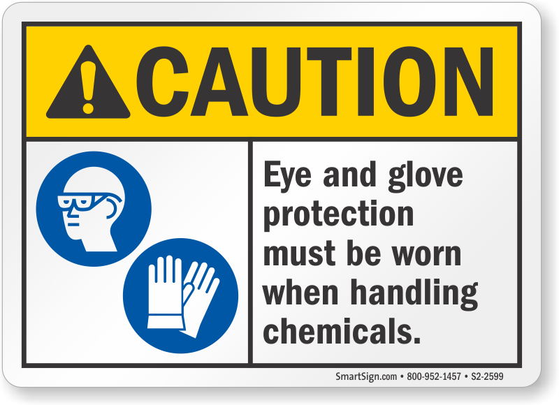ANSI Caution Sign: Eye And Glove Protection Must Be Worn When Handling Chemicals