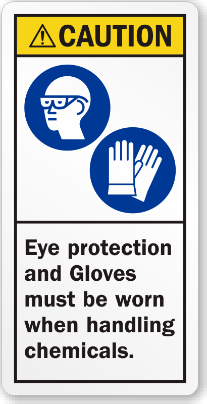 Make safety rules known to the workers. With this ANSI label ask them to wear eye protection and gloves while handling chemicals.