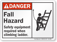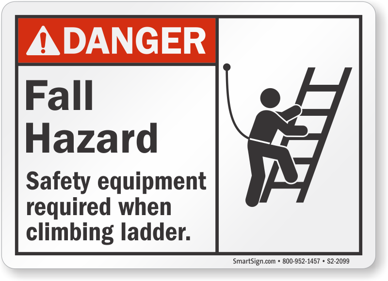 ANSI Danger Sign features a clear pictogram of a person tied with a safety harness—a clear indicator of required PPE while climbing ladder.