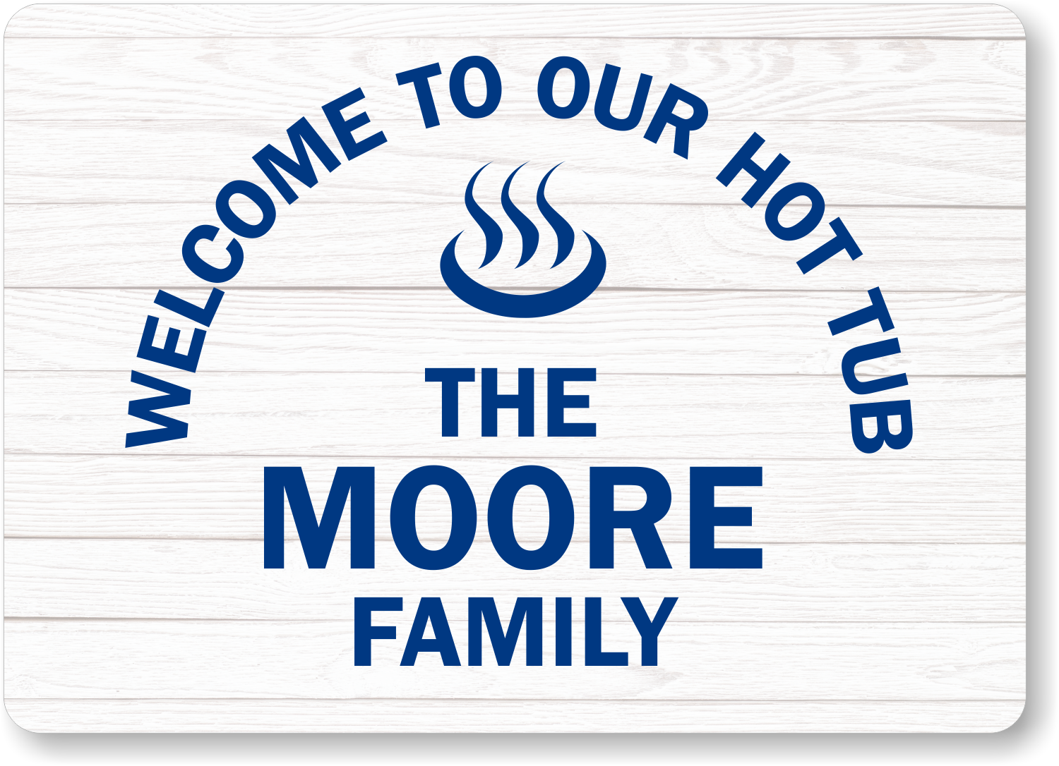 Our sign experts have designed this elegant Welcome To Our Hot Tub sign that can be easily customized with your family name.