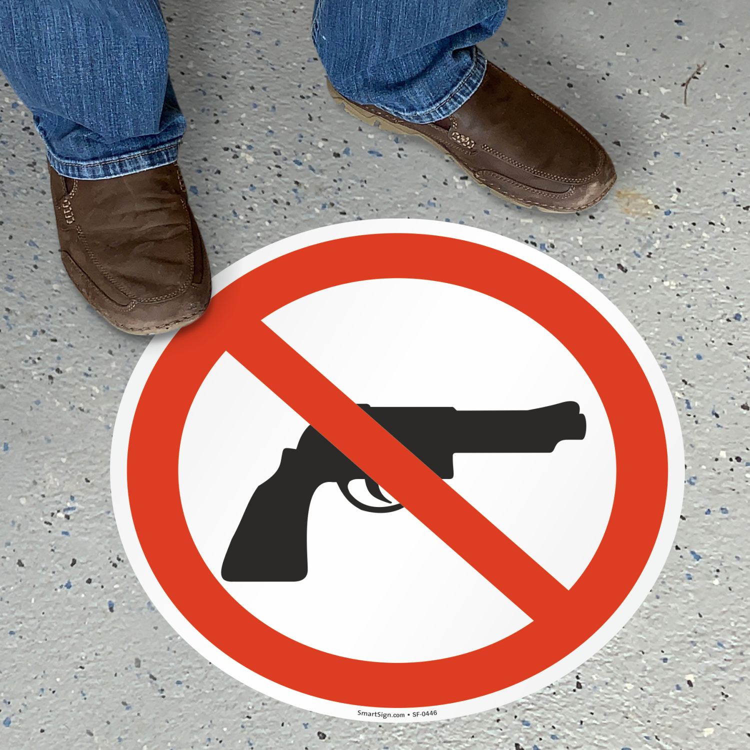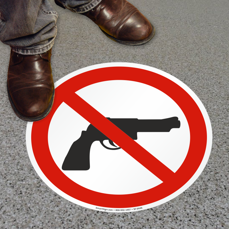 No Guns Allowed - say it clearly with a SlipSafeâ„¢ Floor Sign. Applying the sign to any flat. clean surface will get your Firearms Prohibited symbol noticed by everyone.