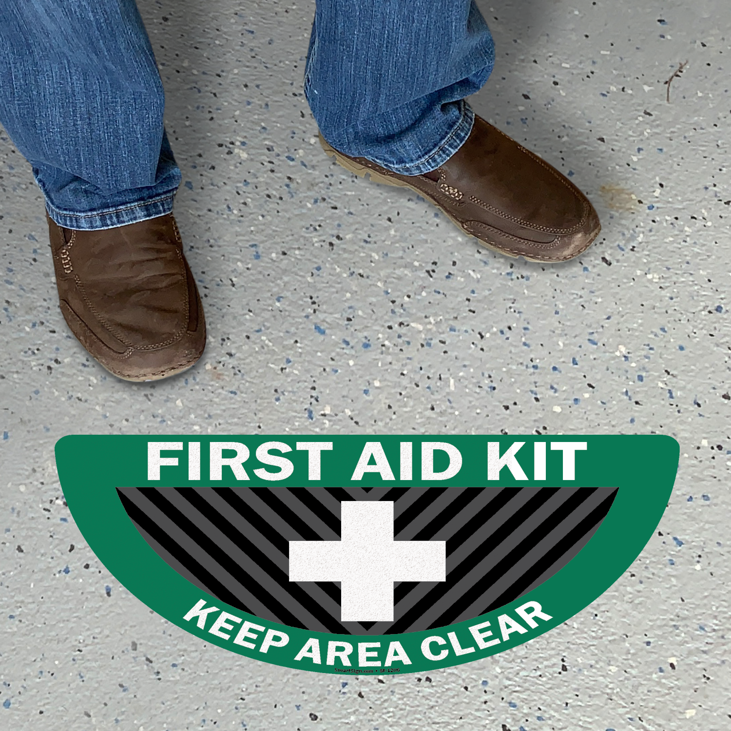 A semi-circular First Aid Kit Floor Sign occupies a lesser area and still conveys your message completely.
