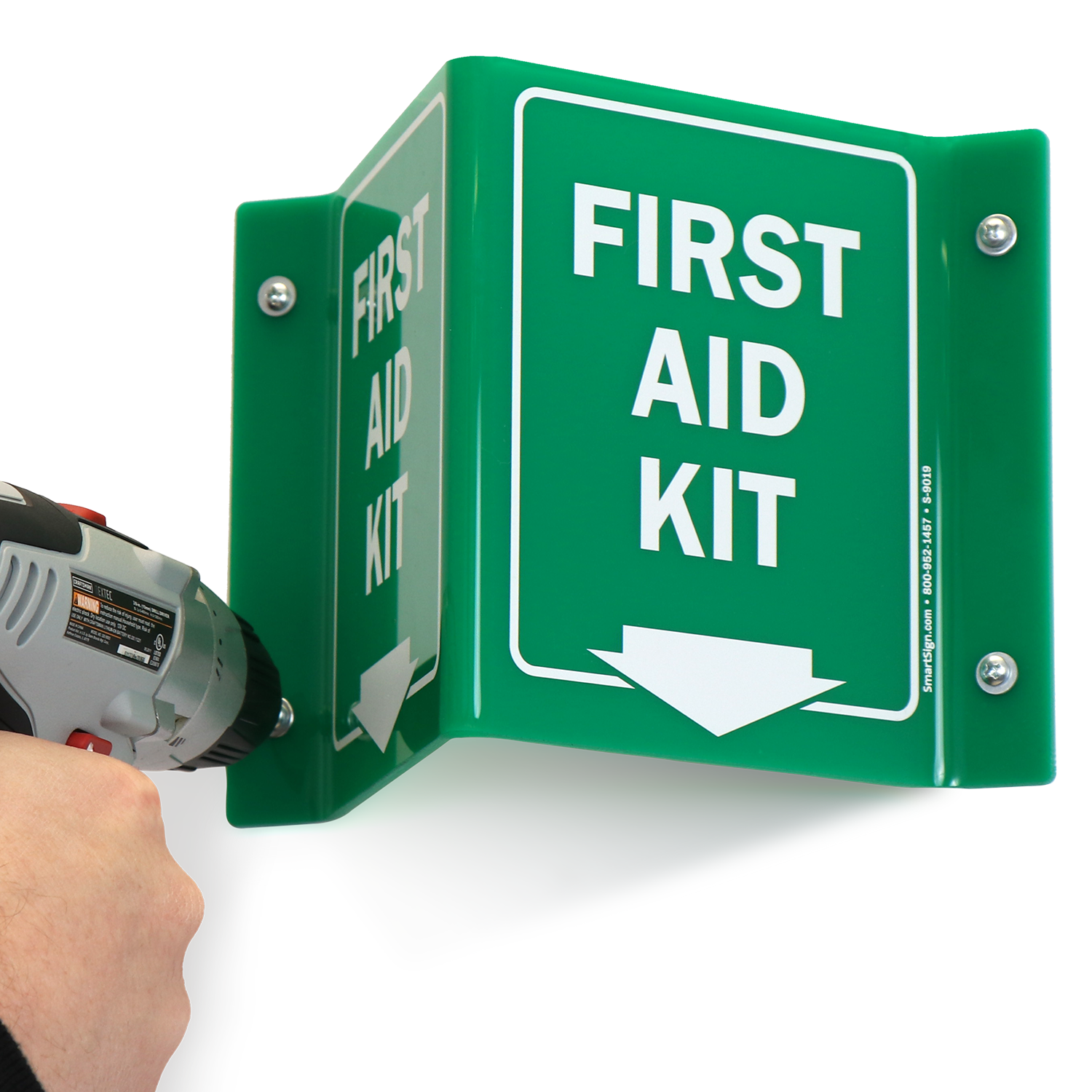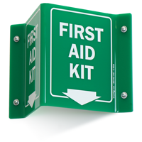 When someone has been injured, there isn't time to root through cupboards or drawers to find the first aid kit. Post a two-sided projected first aid kit sign for maximum visibility.