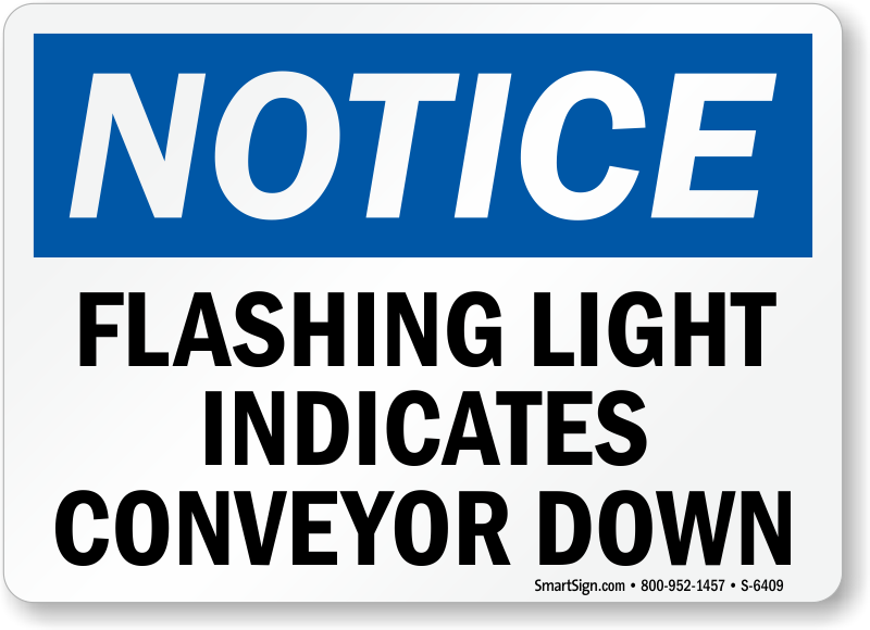 Flashing lights mean that conveyor is down, but will a layman understand? Use this OSHA sign and let them know.