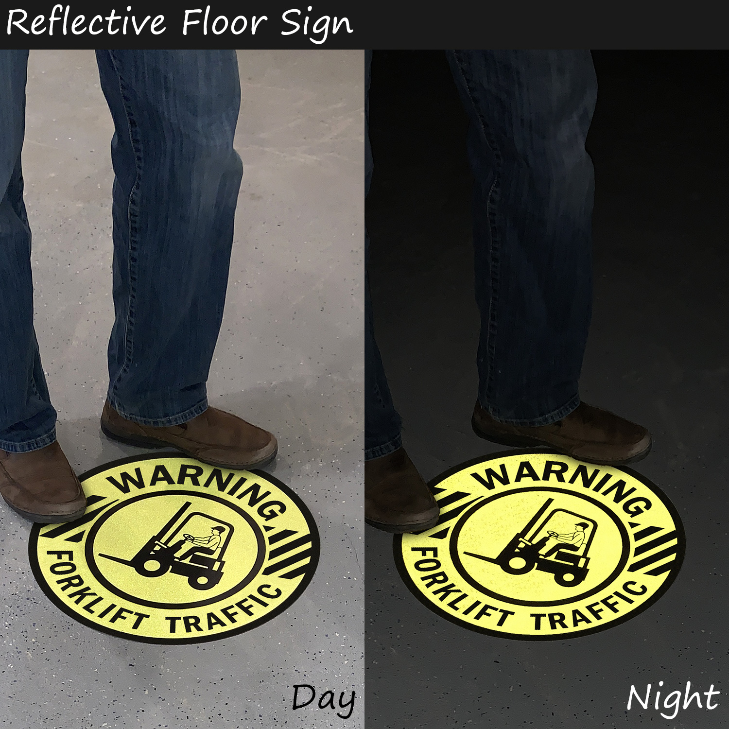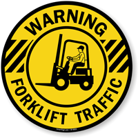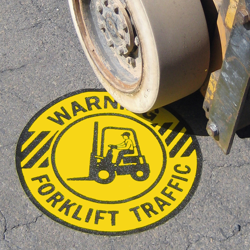 Alert pedestrians to forklift traffic in your facility. Floor messages have heightened visibility as they are right under everyone's nose. Sign is overlaid with either pebble or grit that increases surface friction upon contact and prevents slip and fall accidents.