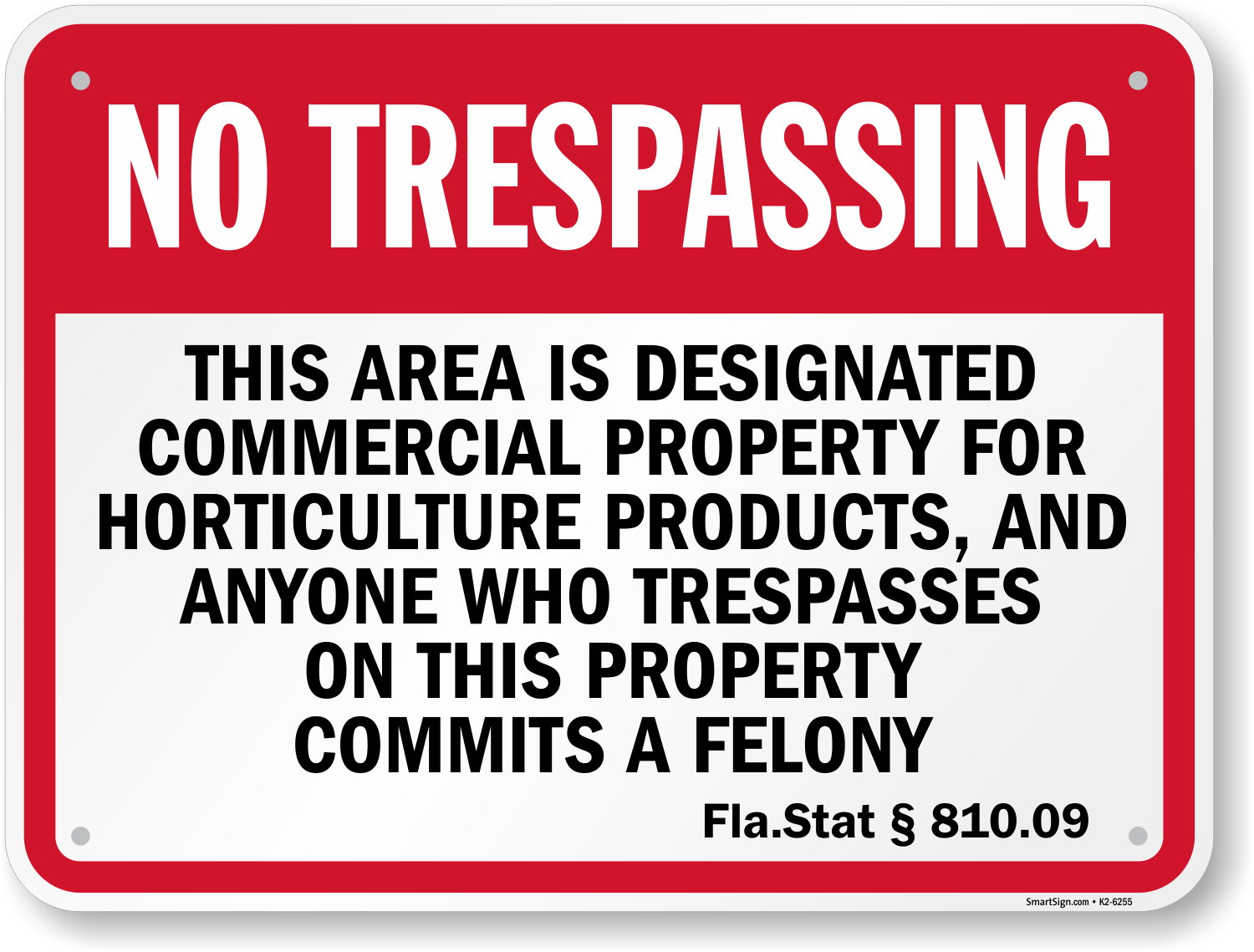 Official Florida No Trespassing Sign: This Area Is A Designated Commercial Property For Horticulture Products, And Anyone Who Trespasses On This Property Commits A Felony - Fla.Stat § 810.09 K2-6255