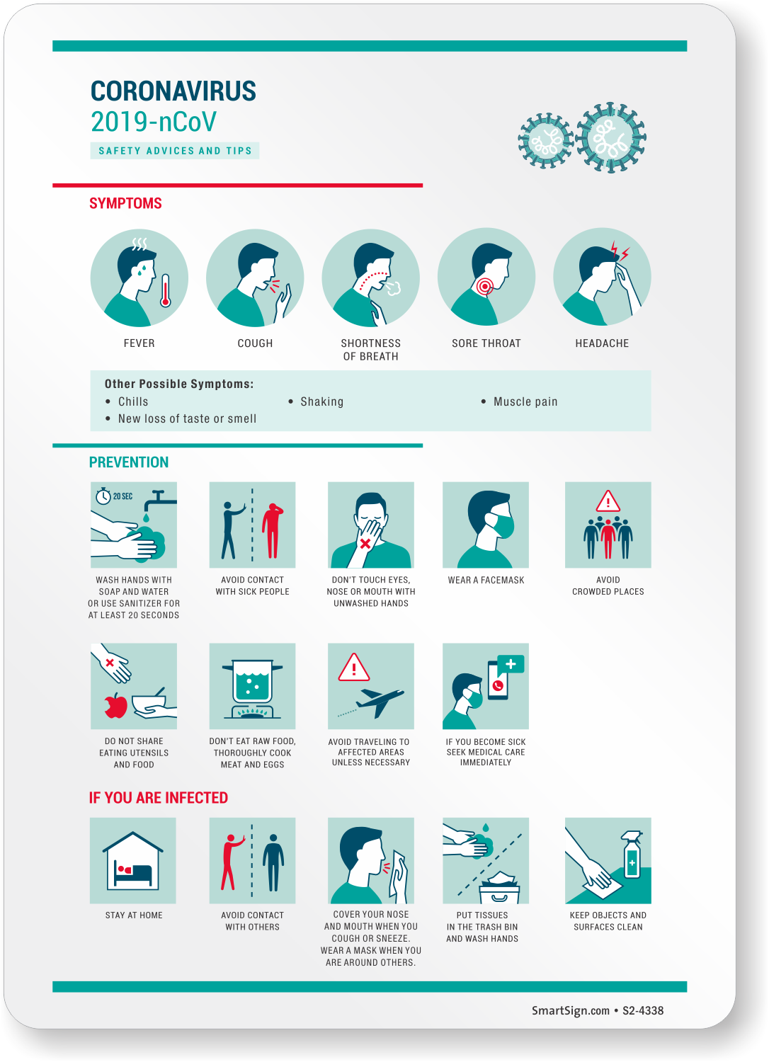 Sign features symptoms to be aware of along with ways to prevent spreading and what to do when infected.