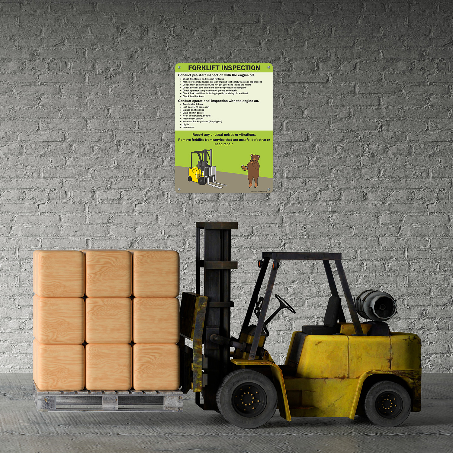 Our friendly bear demonstrates steps to pre and post forklift inspection.