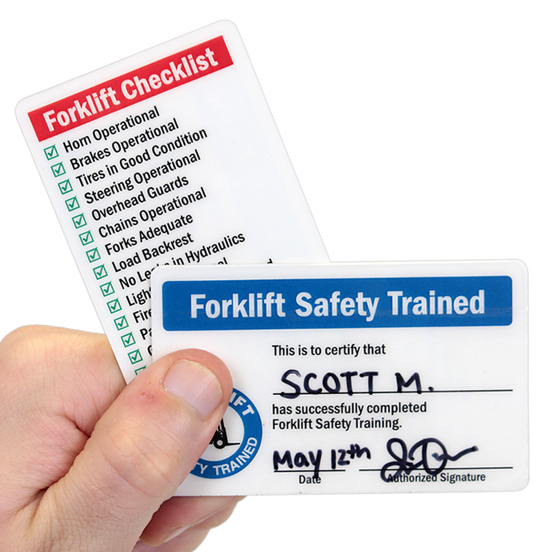 This 'forklift safety trained' wallet card can be used as a proof to validate authorized forklift drivers. The card fits in the credit card slot of wallet and doesn't bend in pocket. Forklift drivers can also use the card as referral to forklift checklist printed on the other side.