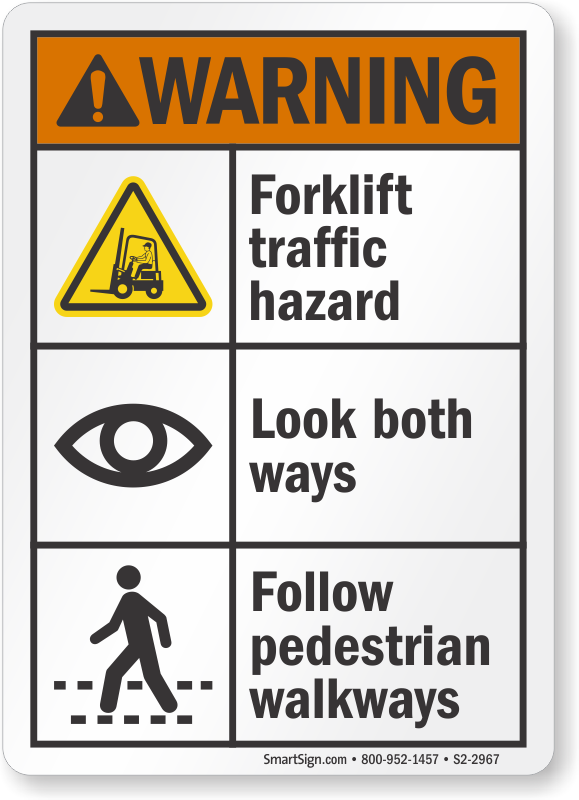 ANSI Warning Sign: Forklift Traffic Hazard, Look Both Ways, Follow Pedestrian Walkways