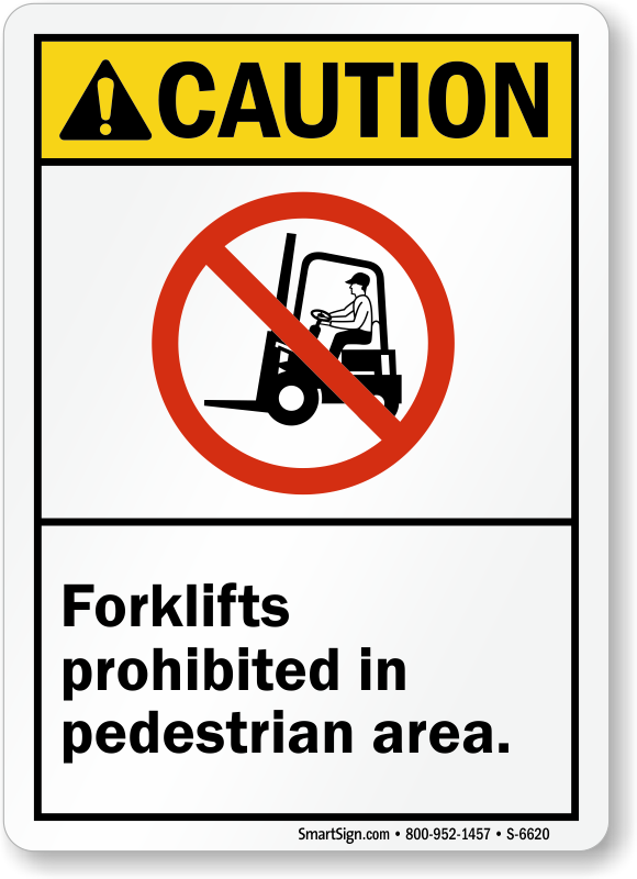 Don't let pedestrians collide with moving forklifts. Prohibit forklifts in pedestrian areas by posting this ANSI caution prohibition sign.