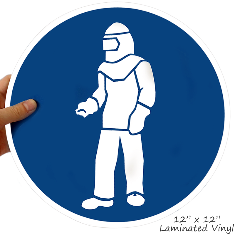 - Graphic on a bold blue background indicates the type of clothing that must be worn when extinguishing a fire of spontaneously combustible material.