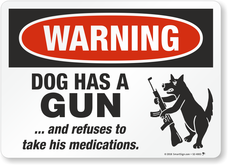 Funny Beware Of Dog Sign: Warning - Dog Has A Gun And Refuses To Take His Medications S2-4003