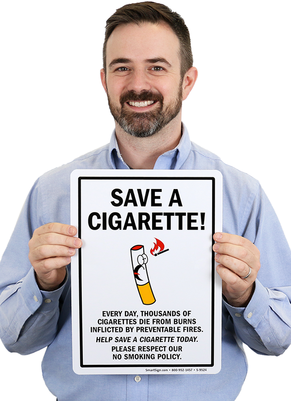 SAVE A CIGARETTE! EVERY DAY, THOUSANDS OF CIGARETTES DIE FROM BURNS INFLICTED BY PREVENTABLE FIRES. HELP SAVE A CIGARETTE TODAY. PLEASE RESPECT OUR NO SMOKING POLICY.