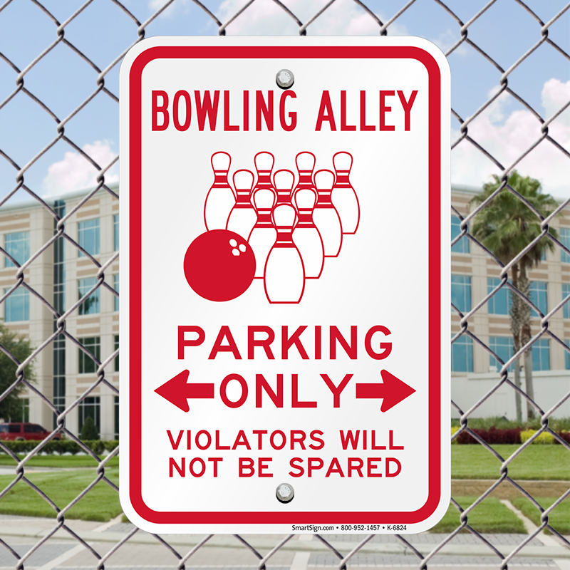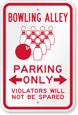 Novelty Parking Sign: Bowling Alley Parking Only, Violators Will Not Be Spared (with Bi-directional Arrow) K-6824 Learn More...