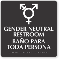Restroom sign complies with ADA regulations and features Grade II Braille, raised text in English and Spanish and a distinctive gender neutral symbol.