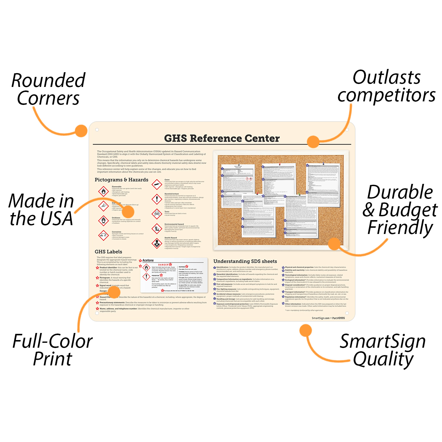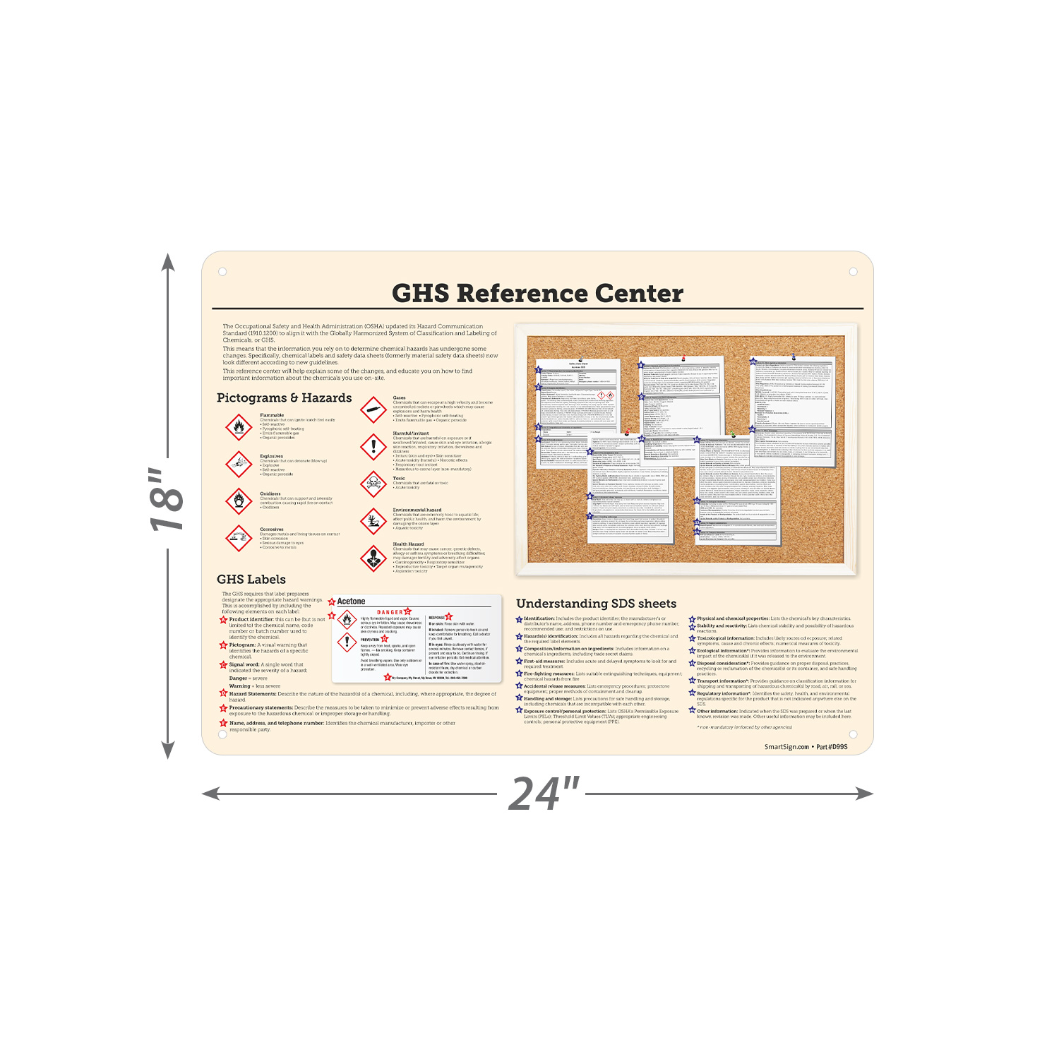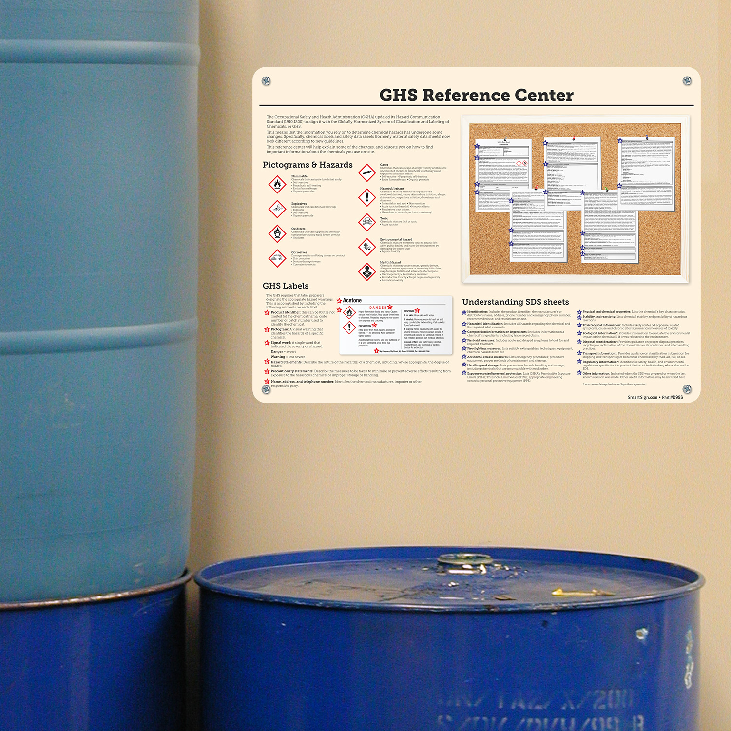 This GHS Reference poster includes examples of a Safety Data Sheet, GHS hazard pictograms, and format of GHS labels.