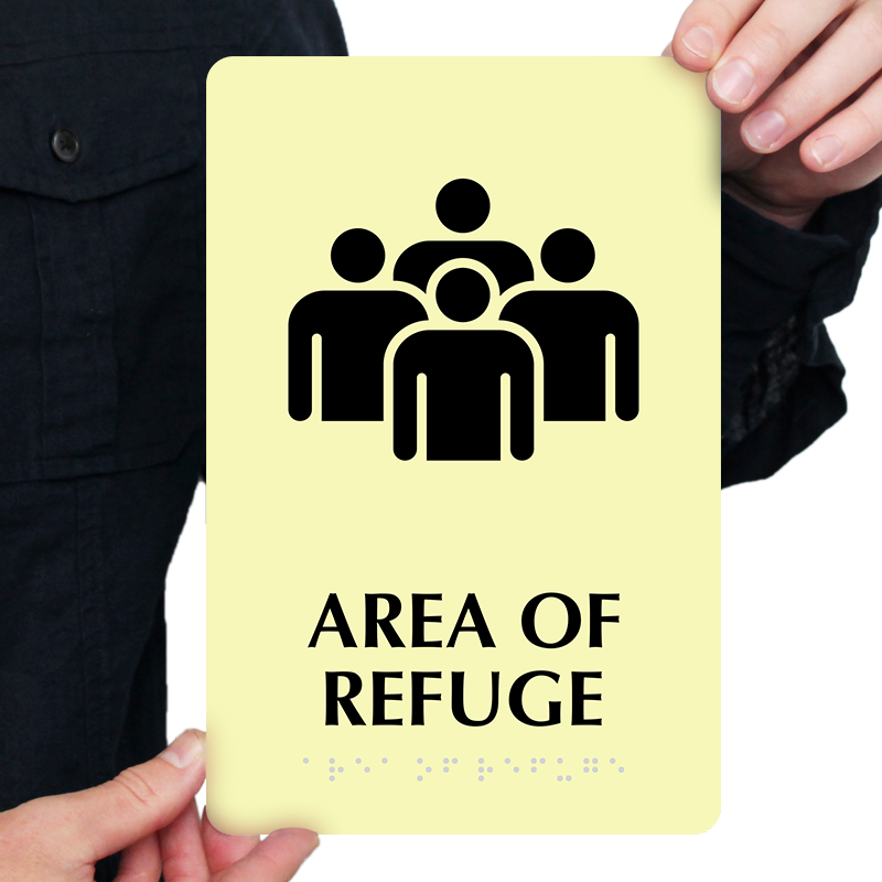 9" x 6" Glow-in-the-Dark TactileTouchâ„¢ Sign with Braille: Area Of Refuge (with Muster Point Pictogram) SB-0338G Learn More...